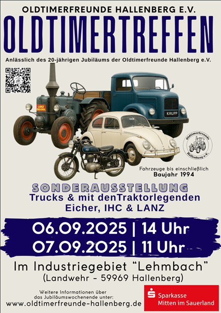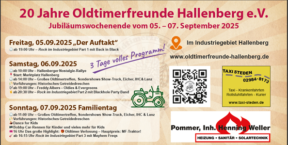 - Der nächste Regionalmarkt der Oldtimerfreunde Hallenberg e.V. findet am 23.08.2025, von 10:00 bis 16:00 Uhr, an der Oldtimerhalle (Weiferweg 15) Hallenberg statt.