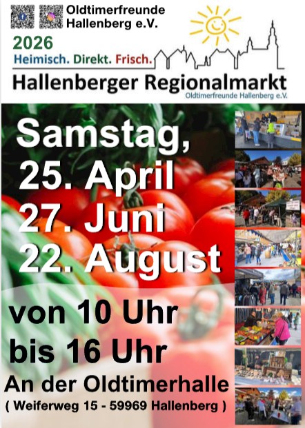 Der Hallenberger Regionalmarkt findet an folgenden Samstagen jeweils in der Zeit von 10:00 bis 16:00 Uhr an der Oldtimerhalle in Hallenberg (Weiferweg 15) statt: