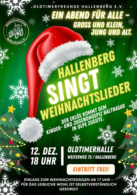 Wie könnte man besser in Weihnachtsstimmung kommen als in herrlichem Ambiente und umgeben von Menschen, die gemeinsam Weihnachtslieder singen? Diese besondere Atmosphäre möchten die Oldtimerfreunde Hallenberg in diesem Jahr erstmals erlebbar machen – und laden herzlich zu einem stimmungsvollen Abend ein.