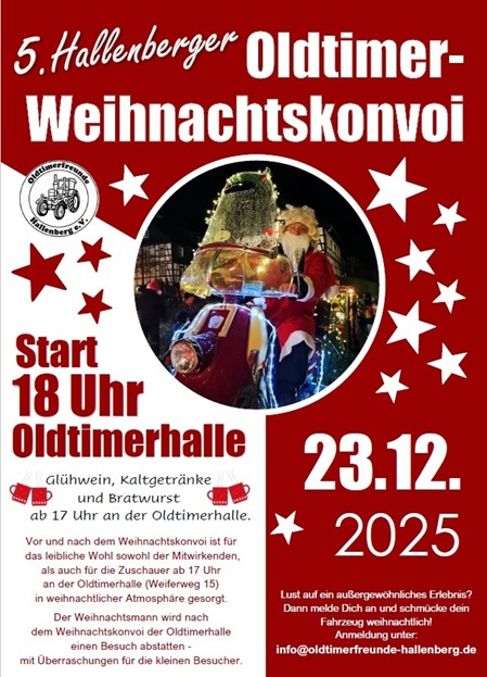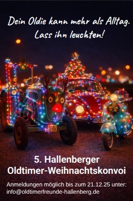 Wenn leuchtende Girlanden über Kühlergrills funkeln und Motoren im Adventstakt brummen, ist klar: Der Oldtimer-Weihnachtskonvoi steht vor der Tür. Am 23. Dezember verwandelt sich Hallenberg wieder in ein stimmungsvolles Lichtermeer, wenn die Oldtimerfreunde zum inzwischen beliebten Vorweihnachtshighlight einladen.