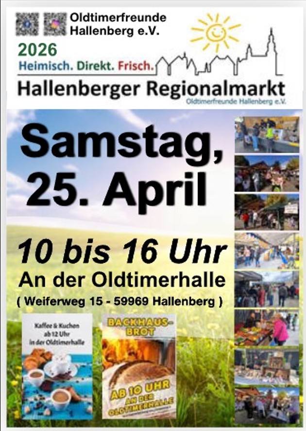Am Samstag, den 25. April ist es wieder soweit. Von 10 bis 16 Uhr verwandelt sich das Gelände an der Oldtimerhalle in Hallenberg(Weiferweg 15) in ein Paradies für Genießer, Entdecker und Freunde regionaler Produkte. Die Oldtimerfreunde Hallenberg laden zum ersten Regionalmarkt in diesem Jahr ein – eine Gelegenheit, die man sich nicht entgehen lassen sollte.