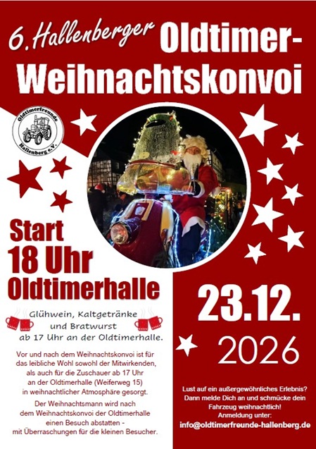 Wenn leuchtende Girlanden über Kühlergrills funkeln und Motoren im Adventstakt brummen, ist klar: Der Oldtimer-Weihnachtskonvoi steht vor der Tür. Am 23. Dezember verwandelt sich Hallenberg wieder in ein stimmungsvolles Lichtermeer, wenn die Oldtimerfreunde zum inzwischen beliebten Vorweihnachtshighlight einladen.